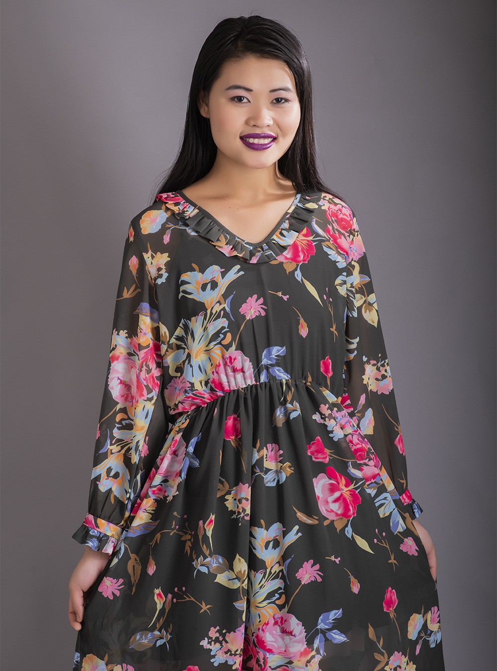 A wear everywhere long dress comes to life in vibrant floral hues. The most comfortable elasticized waist is designed with a V-neckline and ruffles at the edges. Long sleeves with one button cuffs . This dress comes with a adjustable lycra fabric black inner.