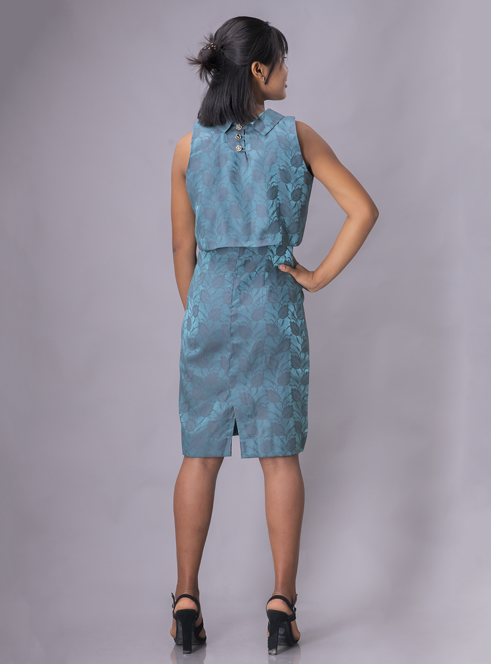 A light weight shiny green jacquard dress designed with a short jacket is the outfit for the season from sun up to sundown for its sumptuous color you will love.
