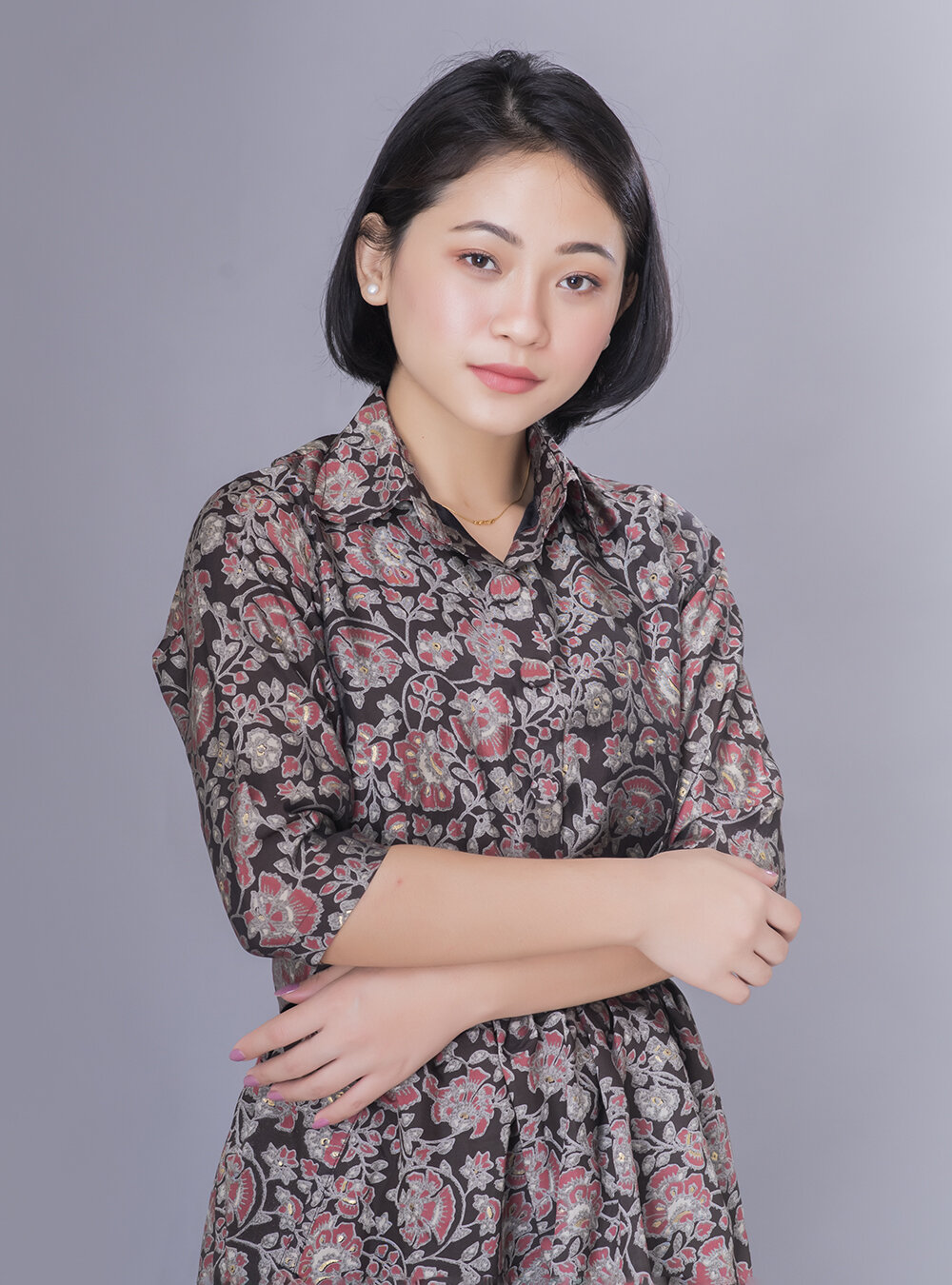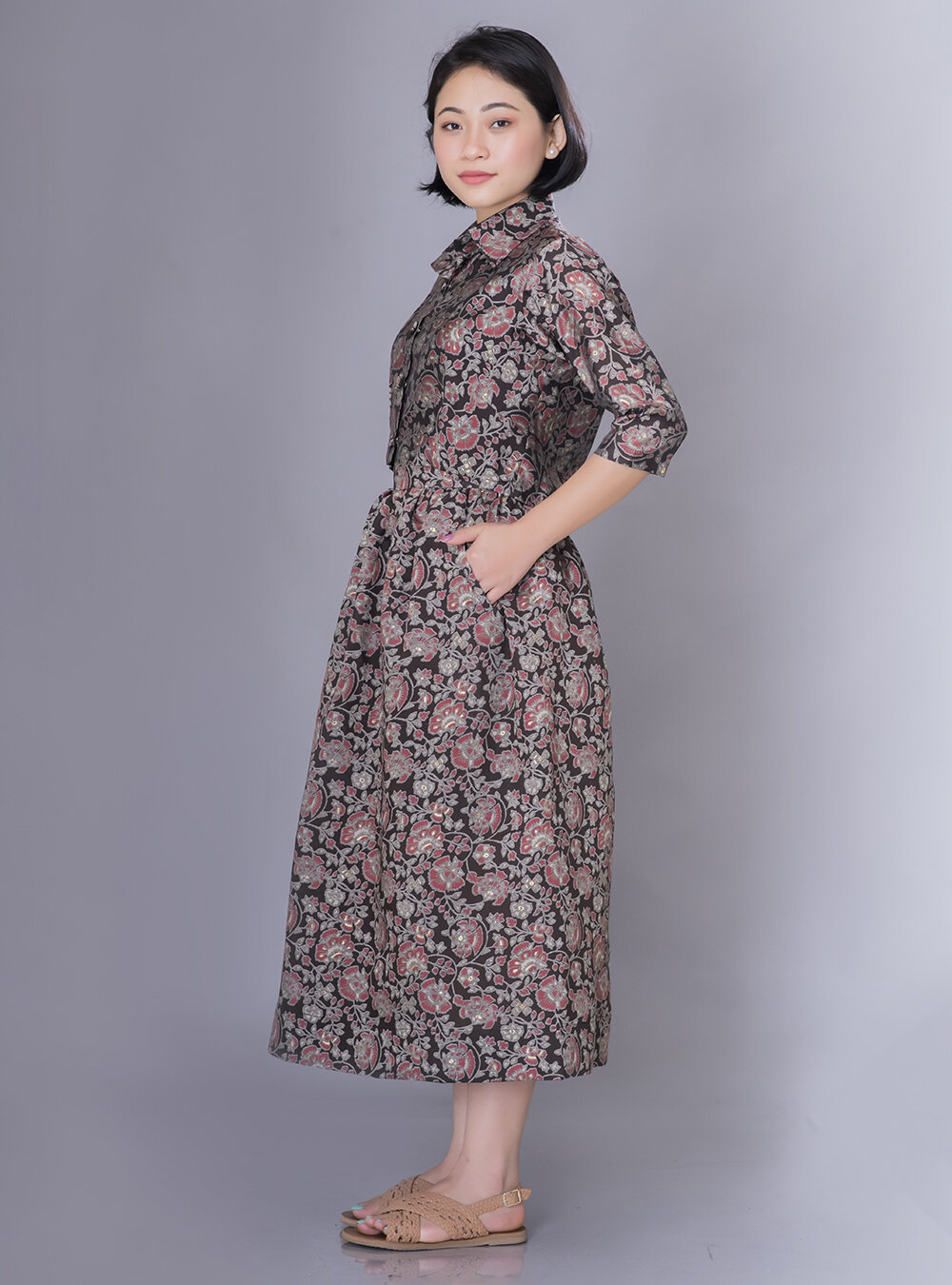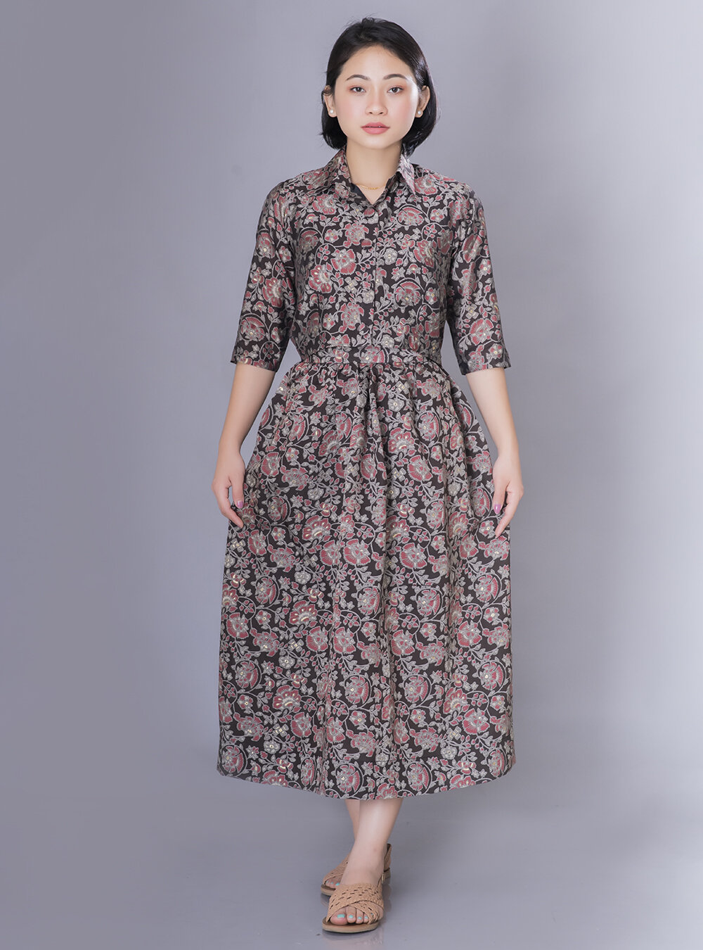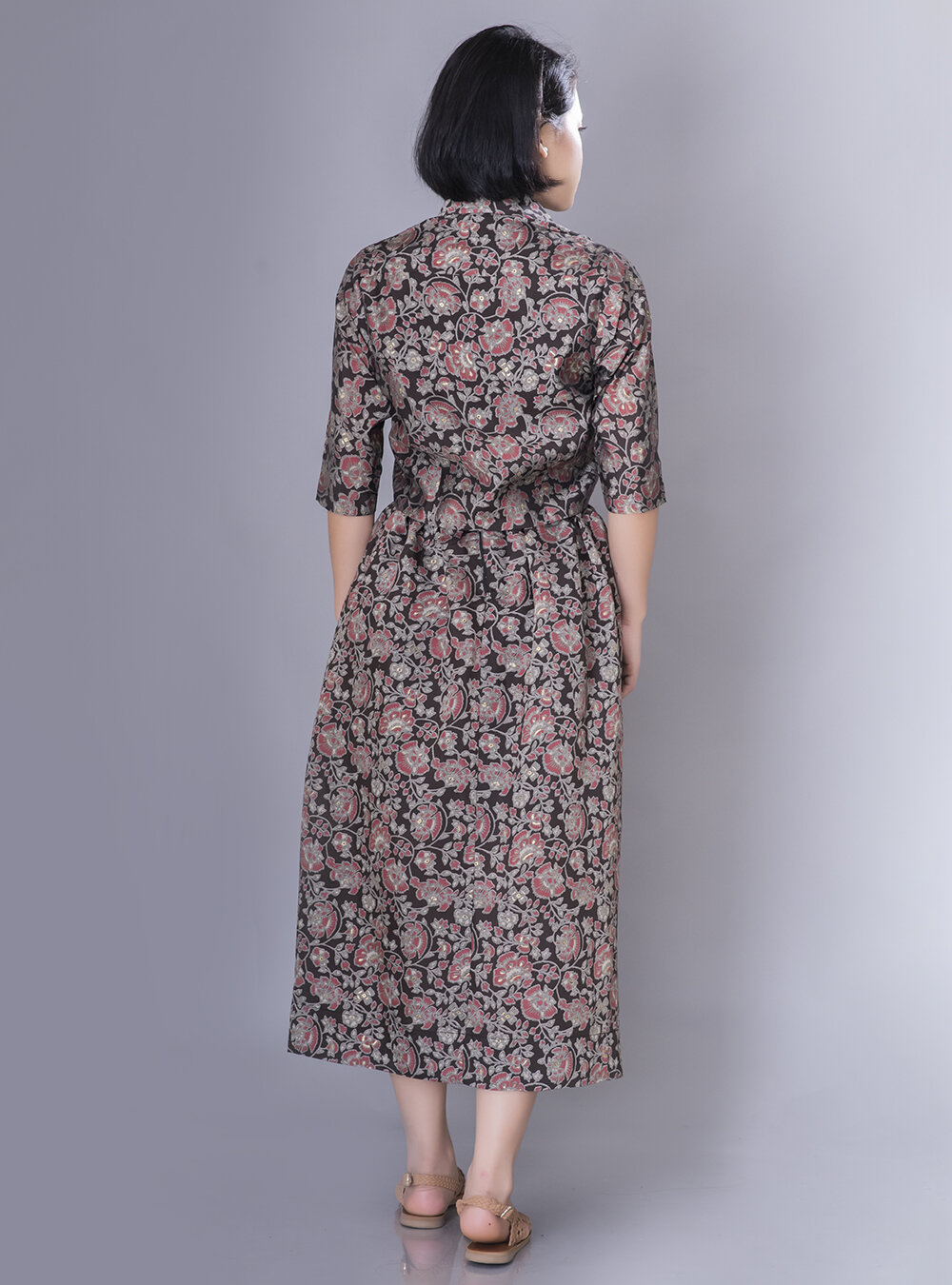 Simply feminine and flattering in a brown floral printed linen satin fabric giving you a comfortable feel to the skin . This outfit comes with a cropped three quarter sleeves front buttoned top and a flare skirt.