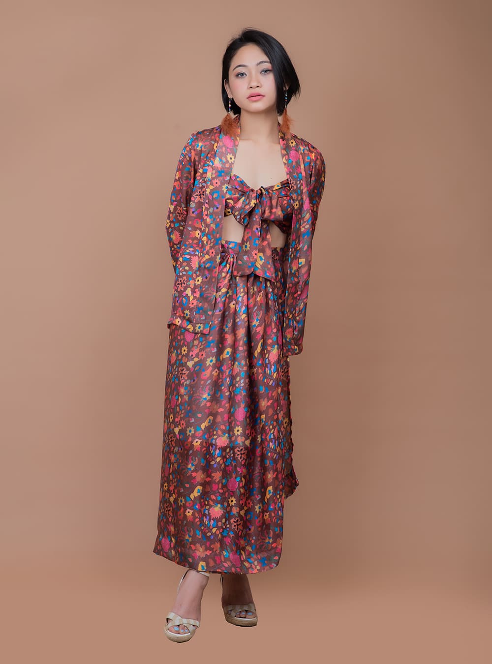 Been dreaming of the white sand beaches and brunch for two or an evening out with friends by the beach. This versatile three piece set features a sarong style skirt with a bikini and a loose flowy jacket. It gives you a oh-so-sexy and stylish from the beach to the bistro in our colorful print with a figure flattering style. Pair it with strappy heels or slip on.
