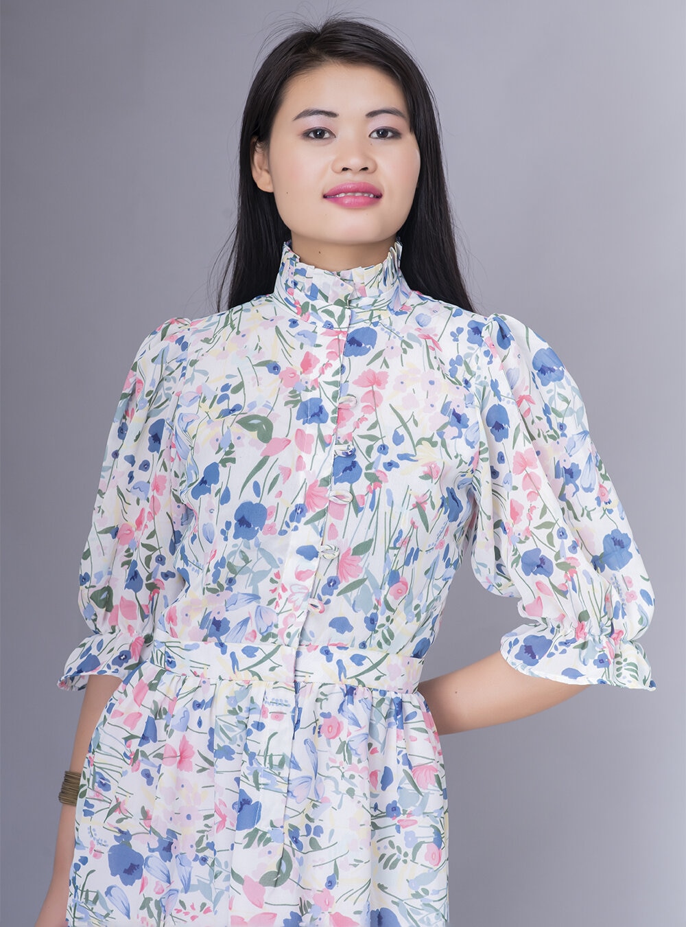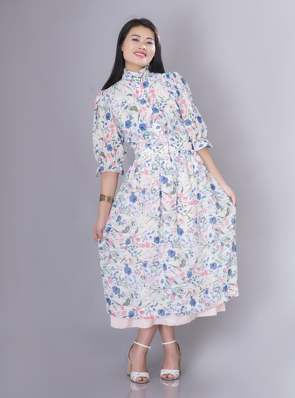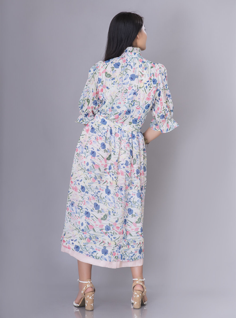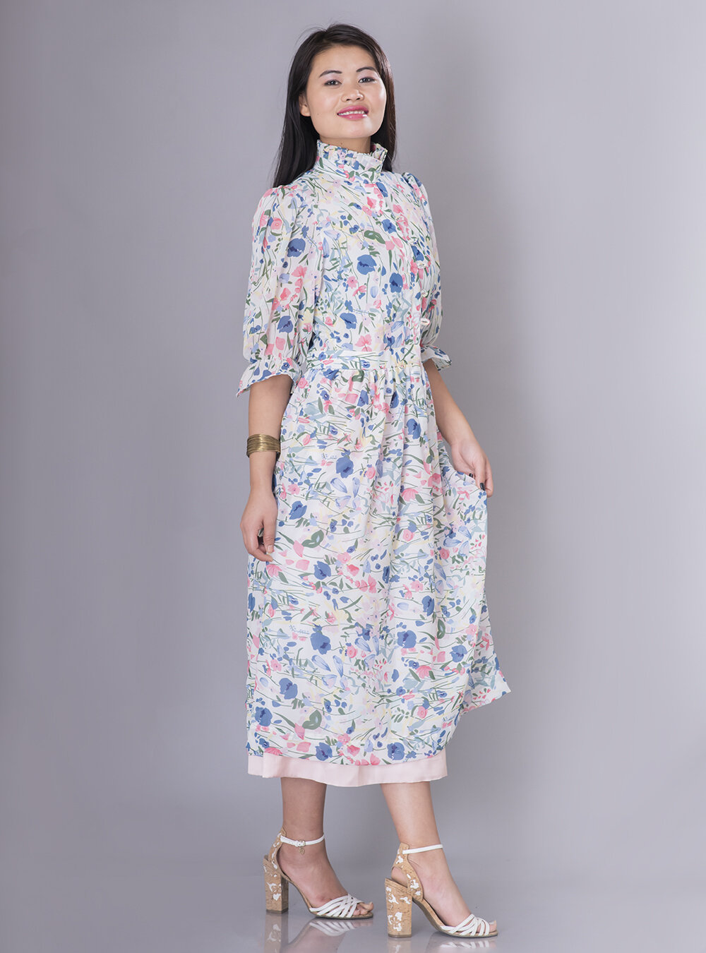 A wear everywhere long dress comes to life in a floral prints. The most comfortable dress is designed with a mandarin collar with ruffles at the edges and ruffles at the edges. Long sleeves with elasticized cuffs. . This bottom is layered with a baby pink satin fabric giving it a contrast look.